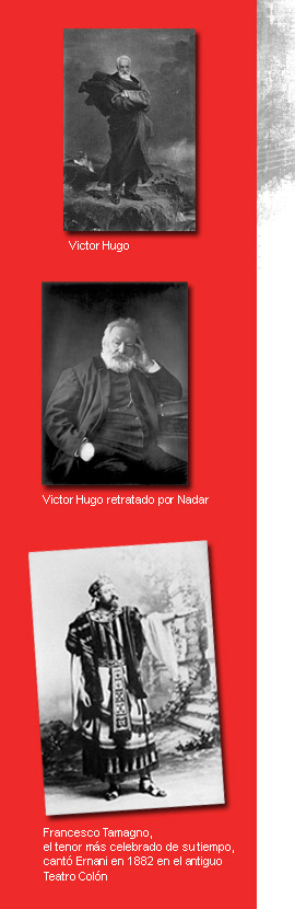 Cuando en 1830 Victor Hugo estrenó en París su drama en cinco actos Hernani , afianzó el Romanticismo en Francia. En su famoso prefacio nos transmite su ideología, a través de la cual exalta la libertad en el arte y condena la persecución a los artistas por parte de la censura, de la policía y de la incomprensión de los hombres para los cuales trabaja el artista. Se muestra optimista ante el futuro y sostiene que el Romanticismo significa "libertad en literatura", y que en un momento la libertad literaria será tan popular como la libertad política, siendo la primera hija de la segunda. Descree de los vanos esfuerzos por reconstruir el Antiguo Régimen, incita a luchar contra la censura y destaca la importancia del papel que debe desempeñar el teatro. Define a su Hernani no como obra de gran mérito, sino como una portadora de conciencia y libertad, que un público concienzudo y libre protegió de sus detractores. En conclusión, Hernani es el estandarte del Romanticismo francés, una proclama en defensa de la libertad en los sectores más importantes de la sociedad. Encontramos una analogía entre el Hernani de Victor Hugo y un drama precedente, Los bandidos ( Die Räuber ), de Friedrich Schiller (1759-1805), autor representativo de ese antecedente del romanticismo llamado Sturm und Drang . En ambas piezas existe una crítica inversión de valores: es el justo quien está del otro lado de la ley. Sobre la pieza del alemán, Verdi compondría años más tarde I masnadieri (Londres, Her Majesty's Theatre, 1847). Regresando al drama que nos ocupa y colocando la atención en el libreto de Piave, el que sigue la trama de la obra puede encontrar situaciones confusas, como tantas veces sucede con los libretos de ópera. Aquí es bueno explicar que por aquel entonces la pieza de Victor Hugo se representaba mucho, la gente la conocía muy bien y no se creyó necesario explicar cosas que se daban por sobreentendidas. A quienes deseen ahondar en este tema, les decimos que hay traducciones al castellano de Hernani muy fáciles de conseguir.
